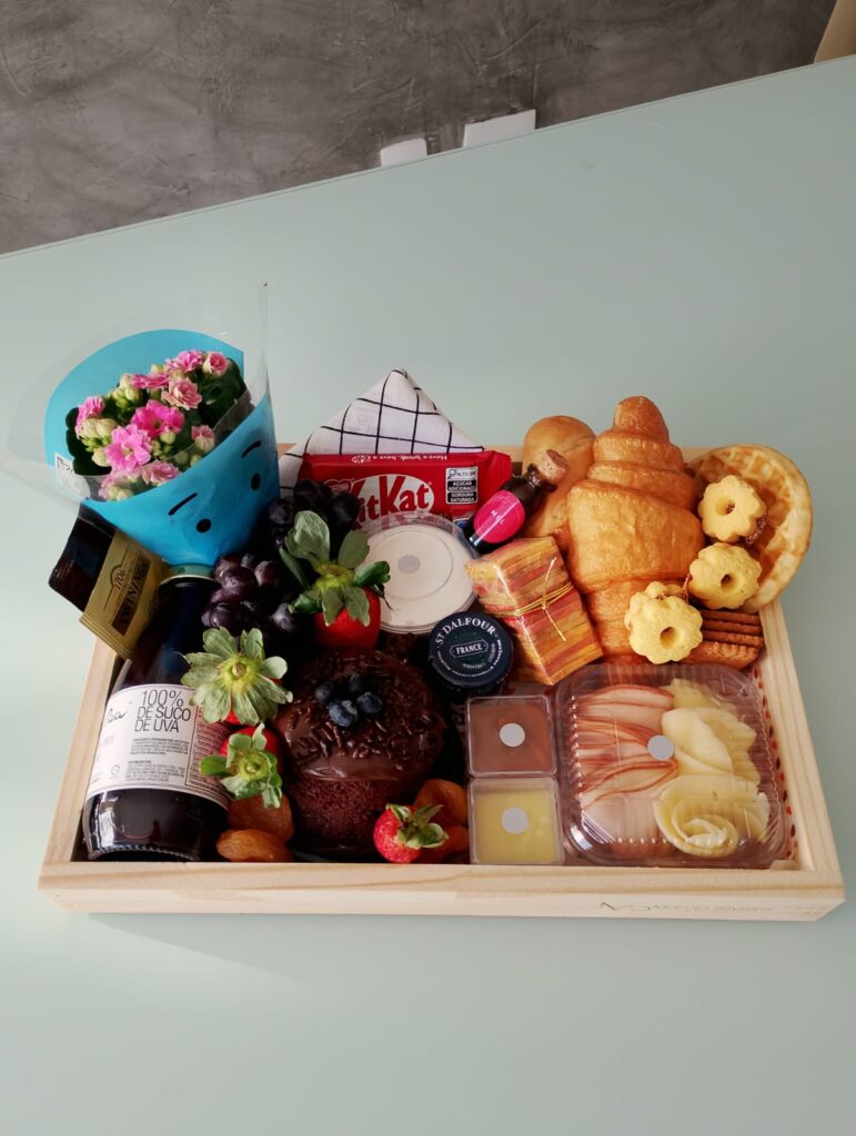 Suco, Dripp Coffe, Chá, Iogurte grego, Pão, Waffle, Croissant, Torradinha, Madeleine, Brownie, Mel, Geleia, Manteiga, Doce de leite, Uva/Morango, Castanha/Damasco/nozes, Queijo Mussarela, Blanquet de peru, Pétalas de Chocolate, Guardanapo de algodão, Mini buquê de flores desidratadas, Mimo bem estar com sais de banho e um lindo Cartão personalizado.