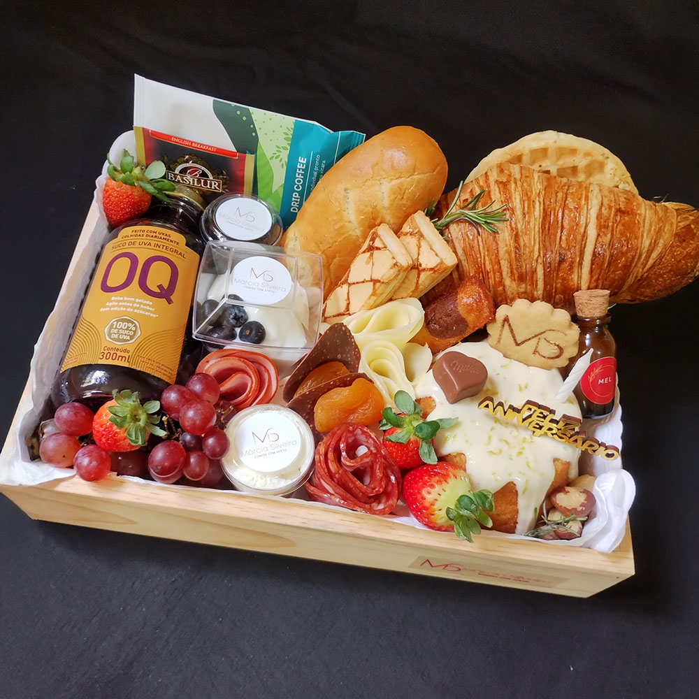 Iogurte Grego, Dripp coffe, Chá, Suco, Queijo Brie, Queijo mussarela, Presunto, Salame Hamburguês ou Blanquet de Peru, Uva/Morango, Geleia, Mel, Mini Bolo, Waflle, Croissant, Pão de queijo, Damasco/castanhas e Cartão.