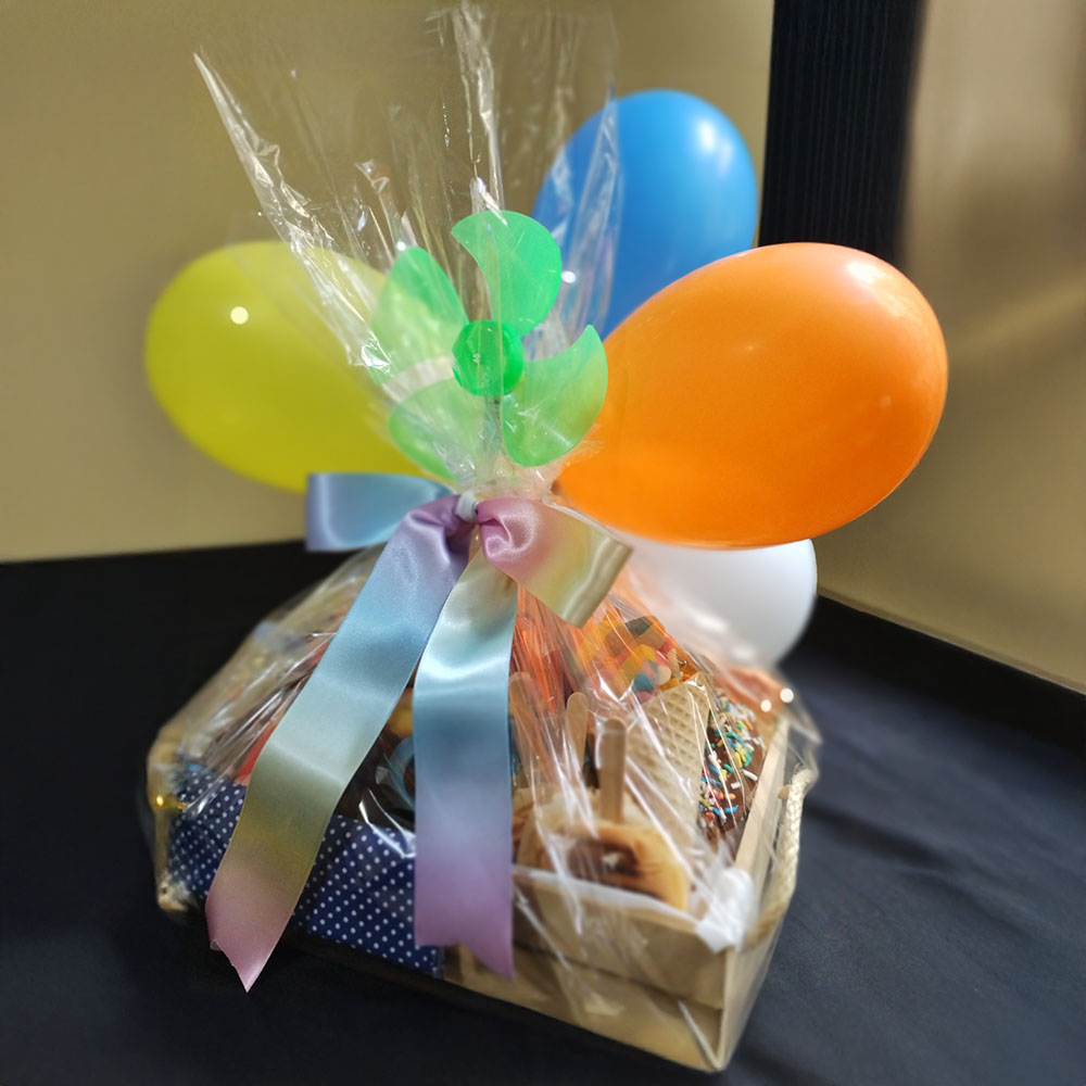 Suco, Achocolatado, Iogurte, Nutella, Geleia, Uva/Morango, Tubete MM&s, Pirulito, Catavento com balinhas, Caneca porcelana com marshmallow e balas, Misto Quente no palito, Pão de queijo, Croissant, Waffle, Donuts e um lindo cartão.
