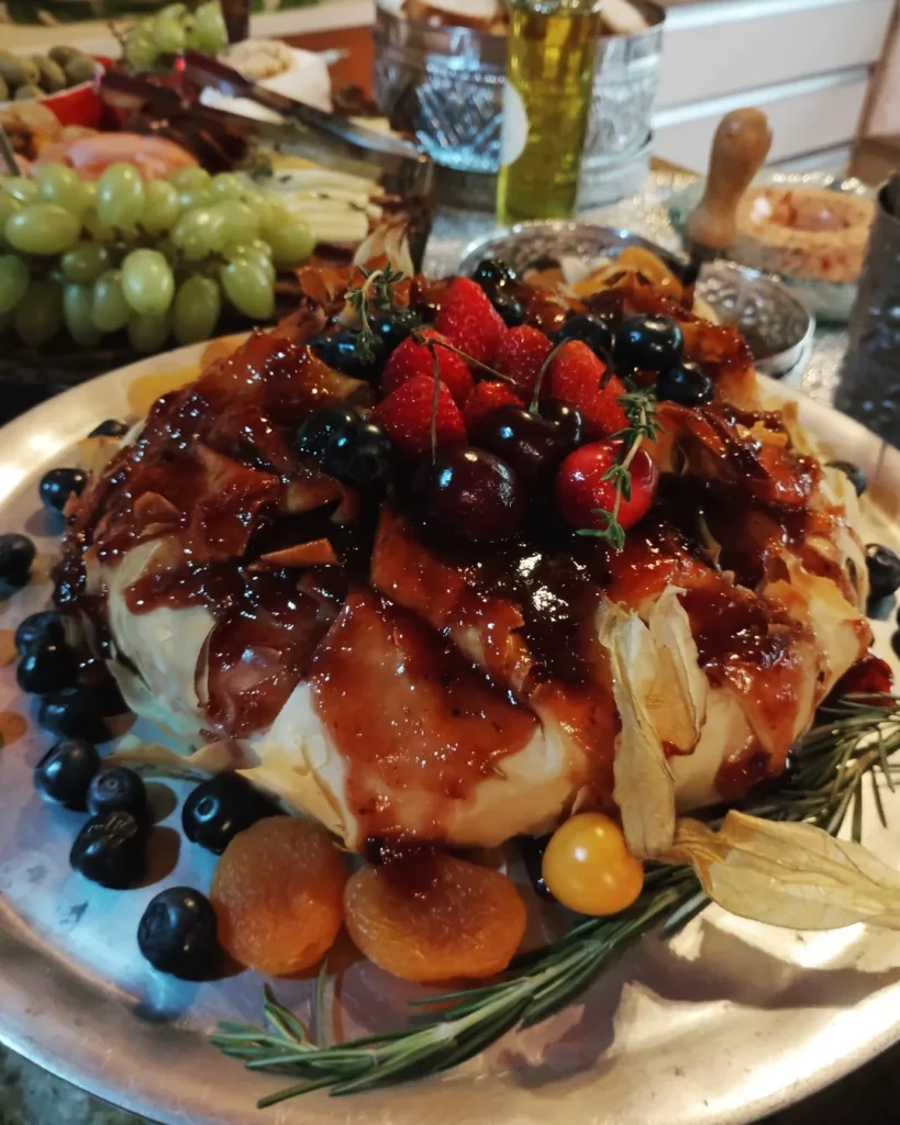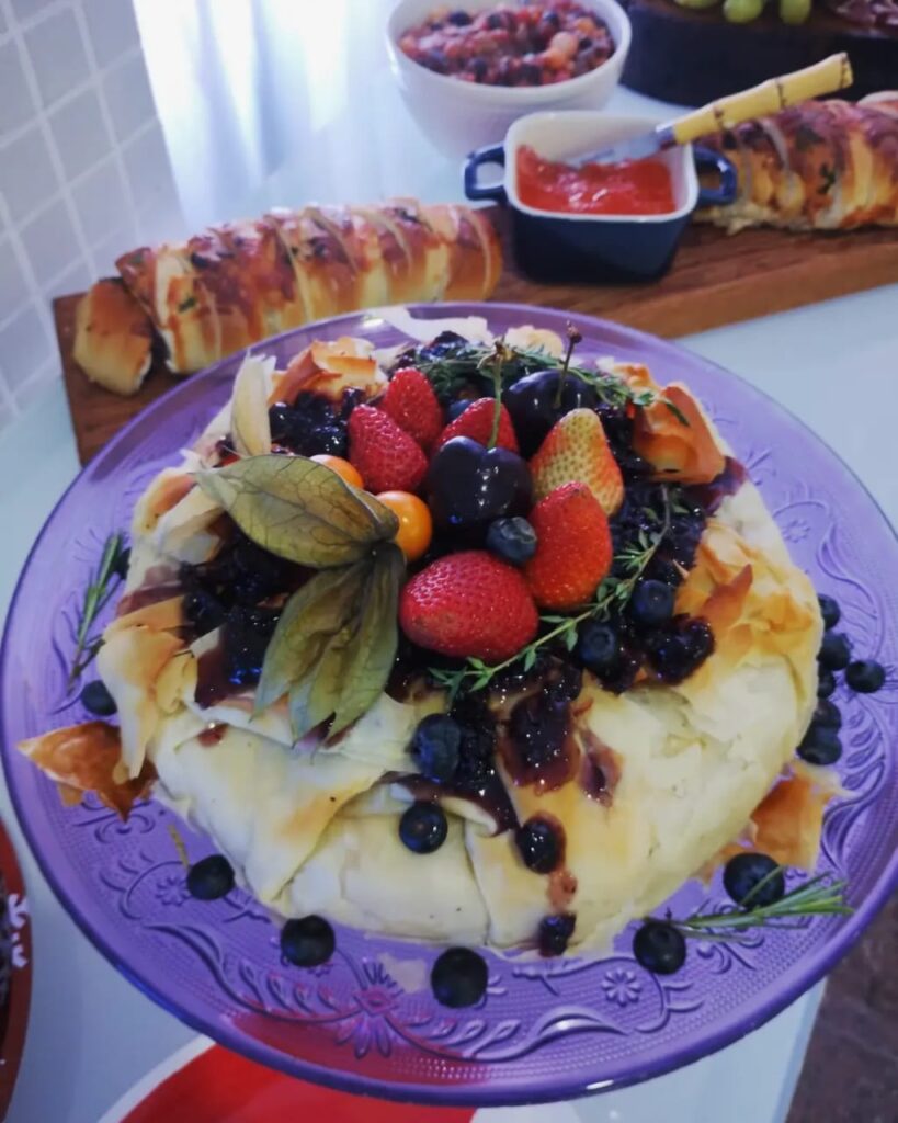 Queijo Brie assado em massa FILLO com as seguintes opções de acompanhamentos: