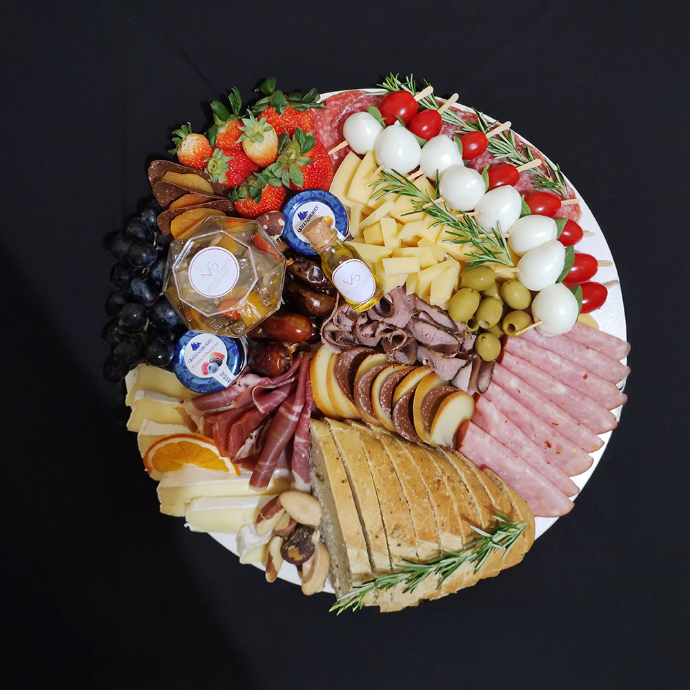 5 tipos de queijos, 4 charcutarias, Geleia, Antepasto, Frutas, Damasco, Castanhas, Azeitonas, Azeite extra virgem, Pão artesanal, Espetinho Caprese (mozarela de búfala, tomate cereja e manjericão), Chocolate e Cartão.