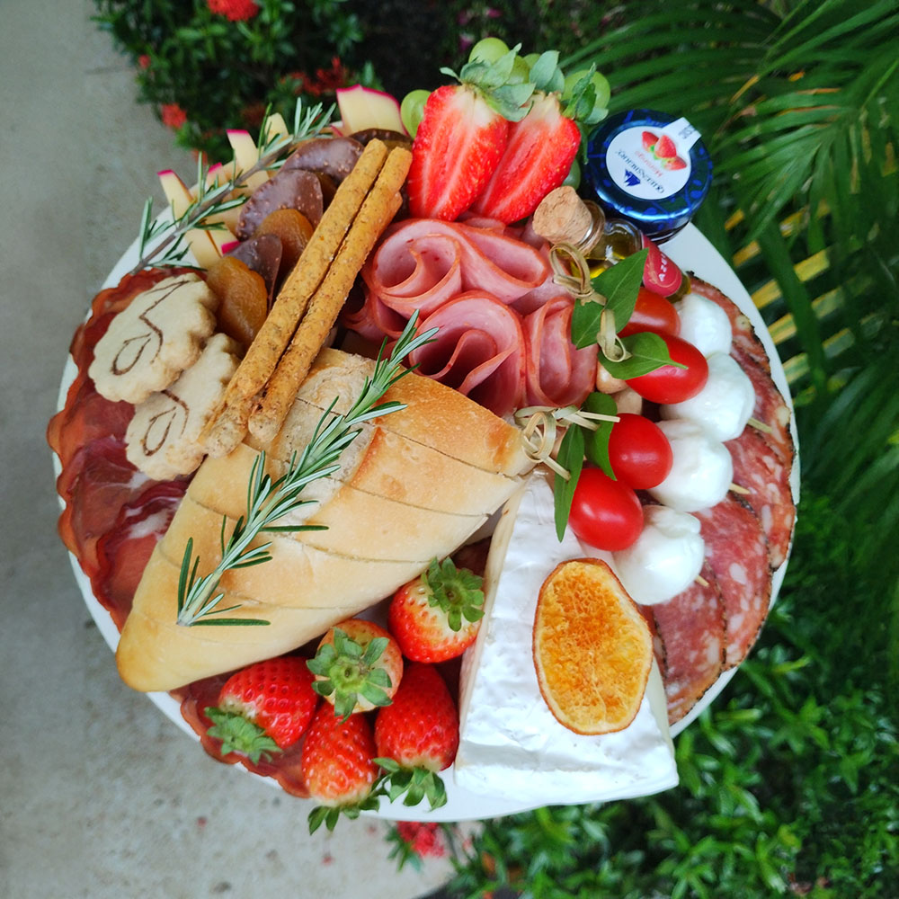 3 Charcutarias, 3 tipos de queijo, Espetinho Caprese (mozarela de búfala, tomate cereja e manjericão), Pão artesanal, Geleia, Azeite extra virgem, Frutas, Damasco, Castanha, Chocolate e Cartão.